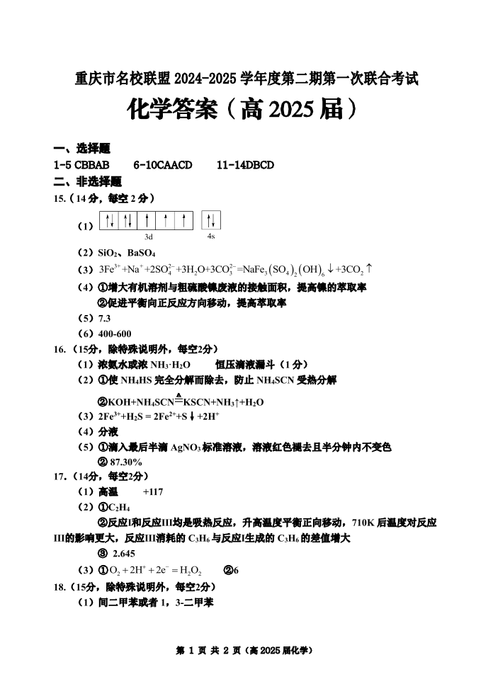 重庆市名校联盟2024-2025学年度第二期第一次联合考试 化学答案.pdf