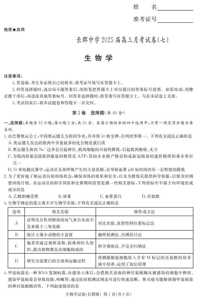 湖南省炎德·英才大联考长郡中学 2025 届高三月考试卷(七)生物.pdf