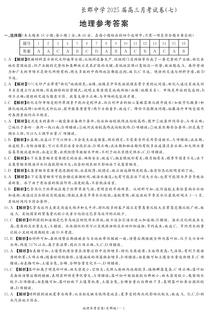 湖南省炎德·英才大联考长郡中学 2025 届高三月考试卷(七)地理答案.pdf