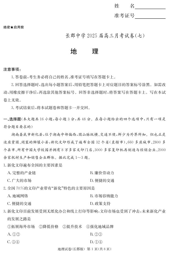 湖南省炎德·英才大联考长郡中学 2025 届高三月考试卷(七)地理.pdf