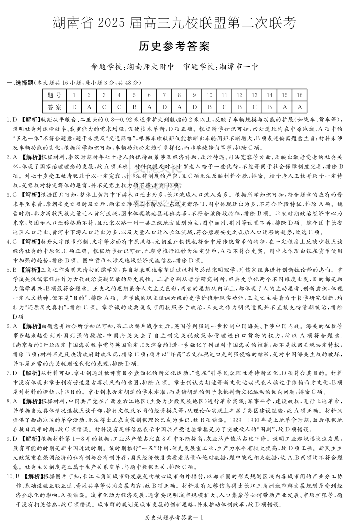 湖南省2025届高三九校联盟第二次联考 历史答案.pdf