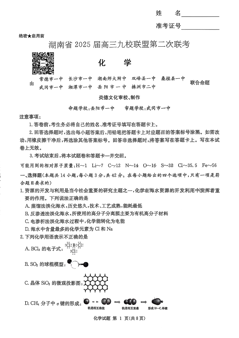 湖南省2025届高三九校联盟第二次联考 化学.pdf
