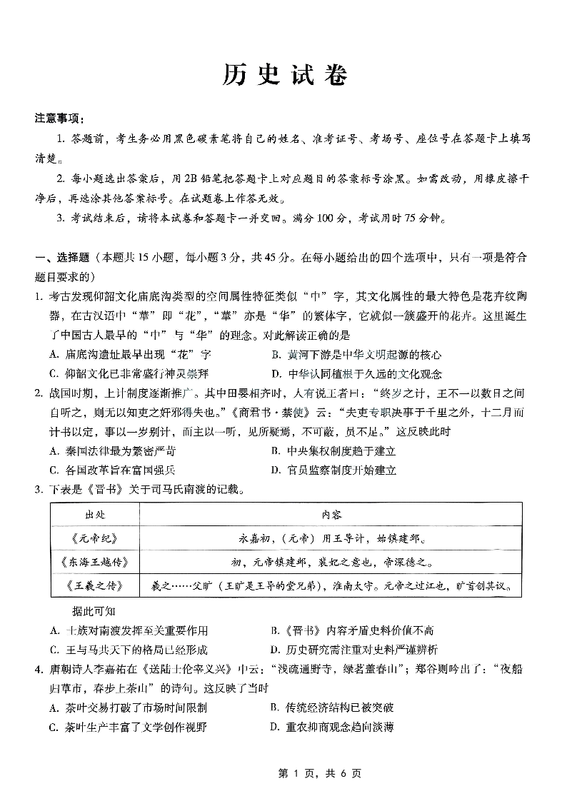 重庆市巴蜀中学高2025届高三3月适应性月考卷(六)历史.pdf