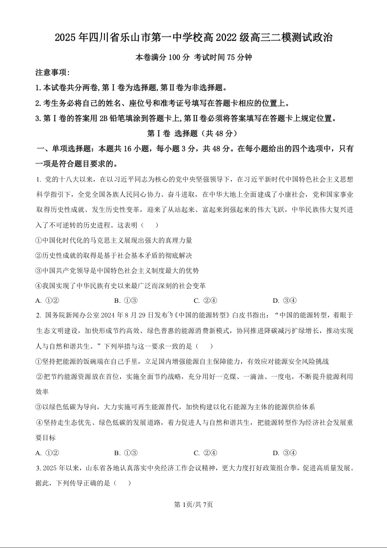 四川省乐山市第一中学校高2022级高三二模测试 政治.docx