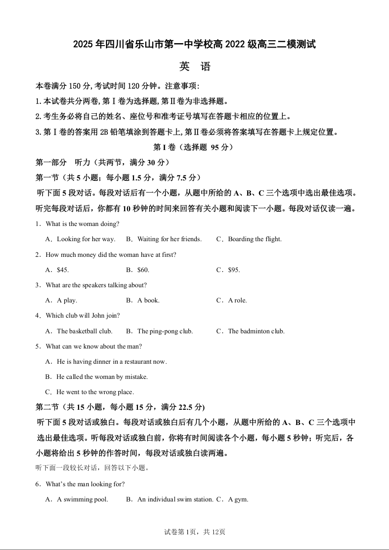 四川省乐山市第一中学校高2022级高三二模测试 英语(含答案).docx