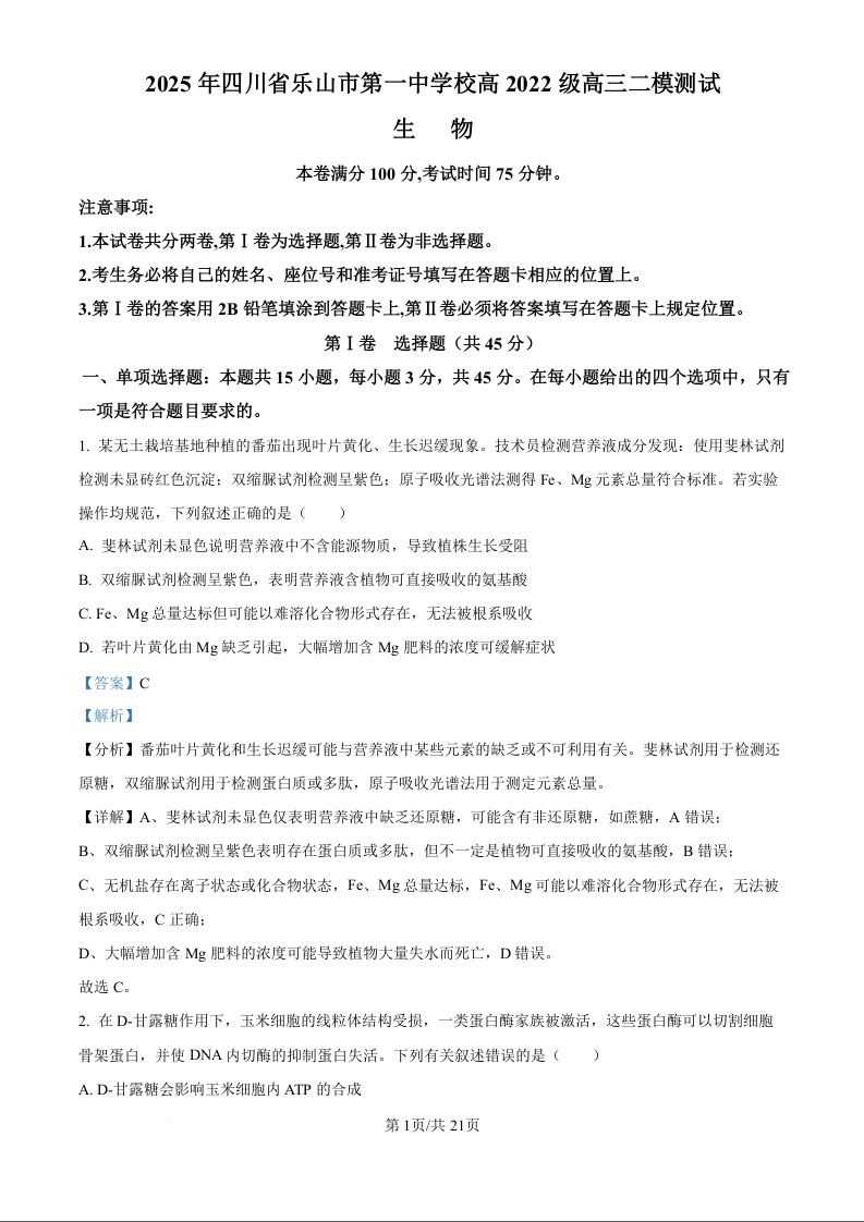 四川省乐山市第一中学校高2022级高三二模测试 生物答案.docx