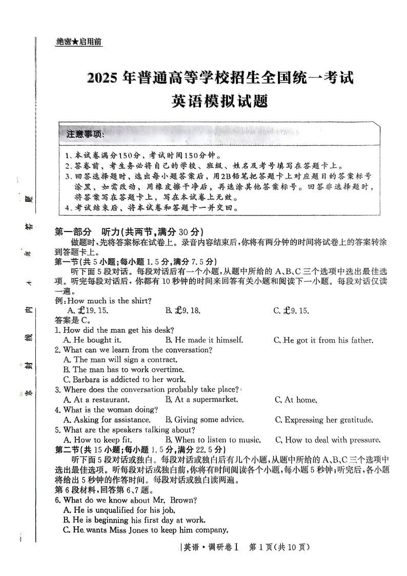河北省2025年普通高中学业水平选择性考试·调研卷I 英语(含答案).pdf