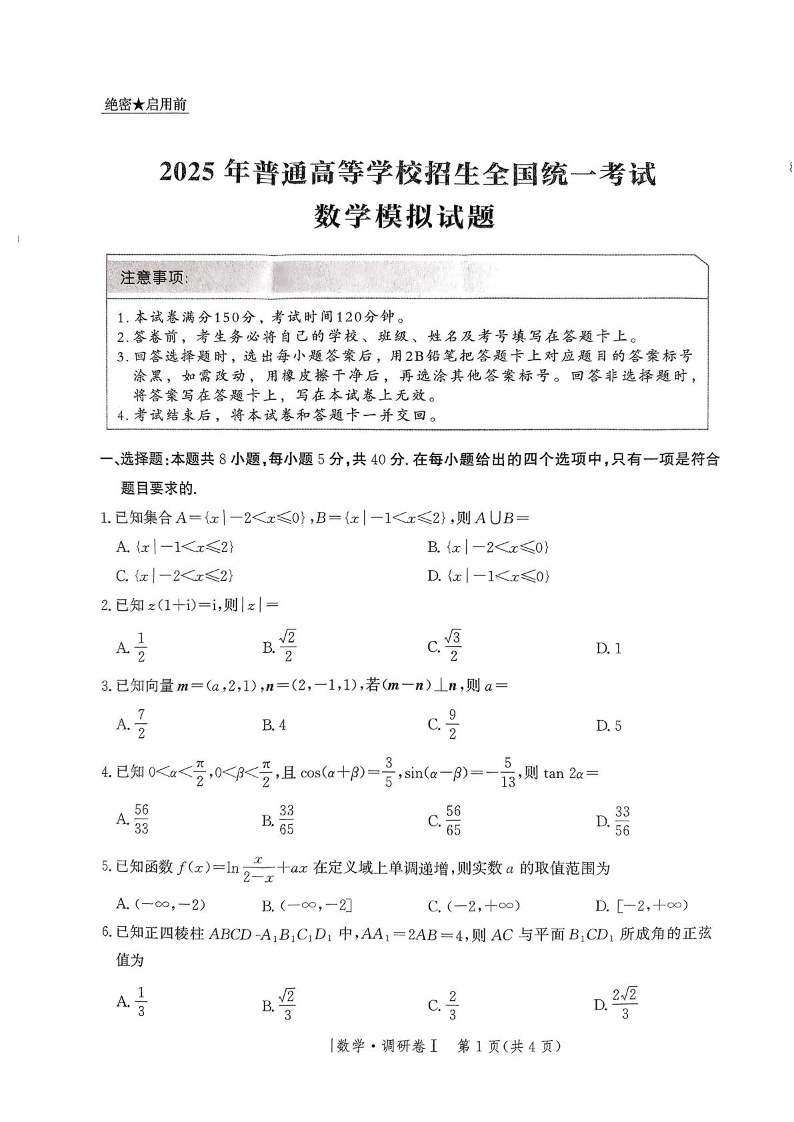河北省2025年普通高中学业水平选择性考试·调研卷I 数学(含答案).pdf