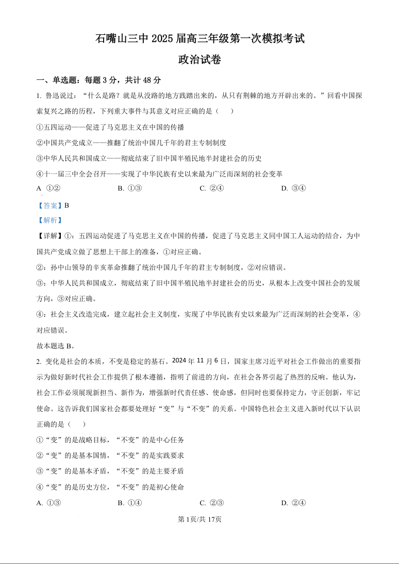 宁夏石嘴山市第三中学2025届高三下学期第一次模拟考试 政治答案.docx