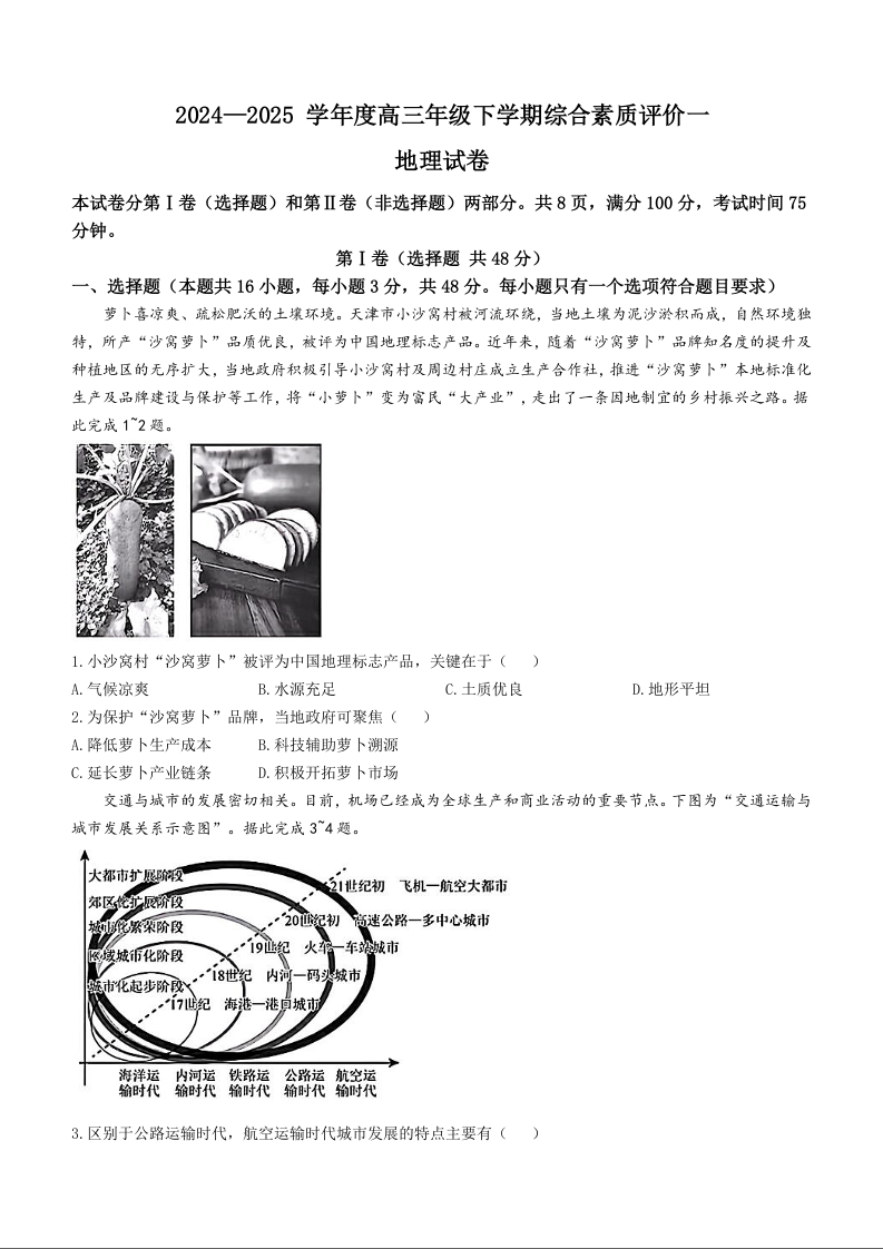 河北省衡中同卷2025届高三下学期综合素质评价(一)地理(含答案).docx