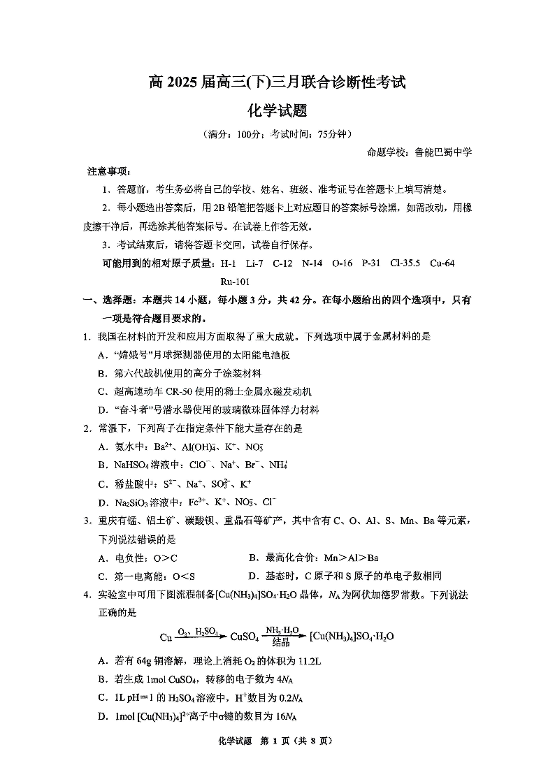 西附、育才、鲁巴高三3月联考 化学.pdf