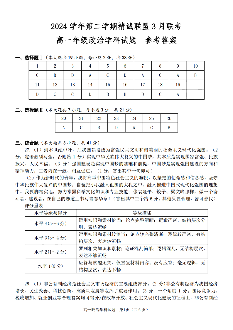 浙江省精诚联盟2024学年高一第二学期3月联考 政治答案.pdf