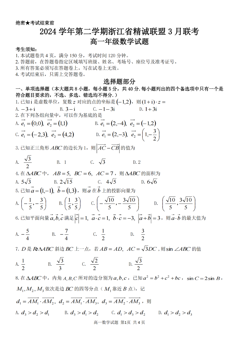 浙江省精诚联盟2024学年高一第二学期3月联考 数学.pdf