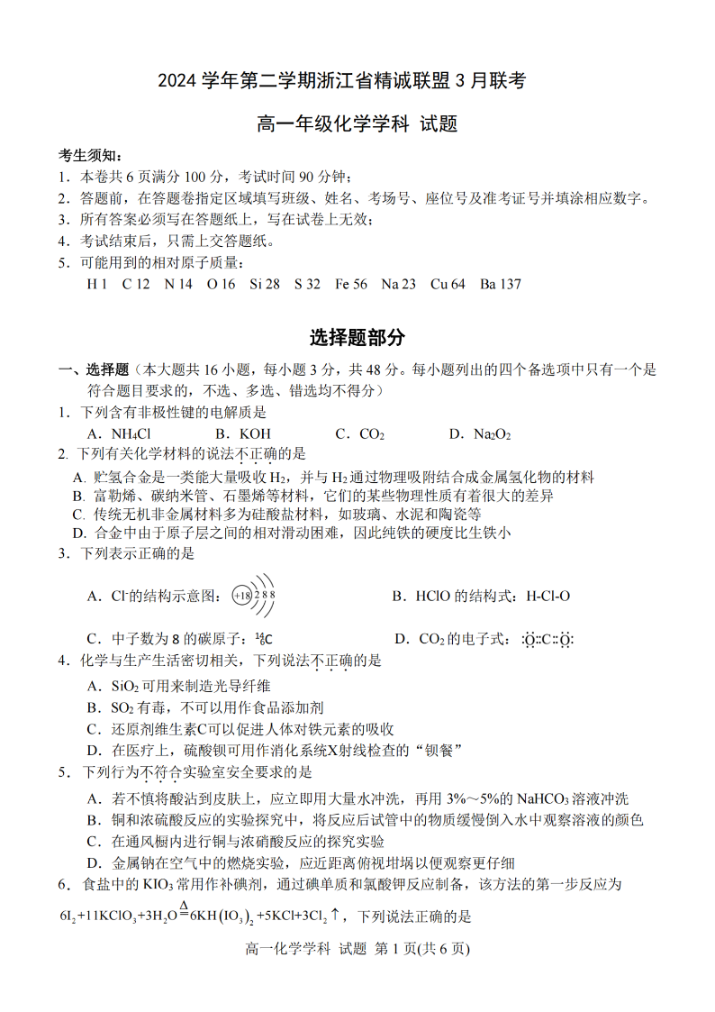 浙江省精诚联盟2024学年高一第二学期3月联考 化学.pdf