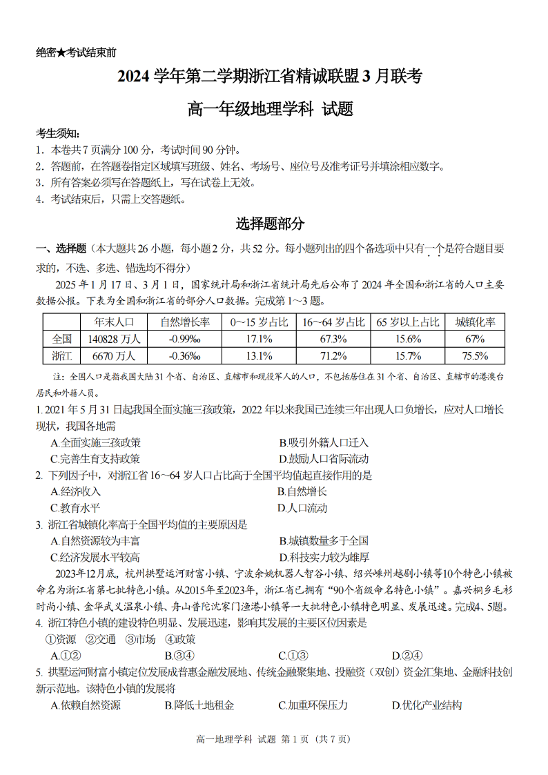浙江省精诚联盟2024学年高一第二学期3月联考 地理.pdf
