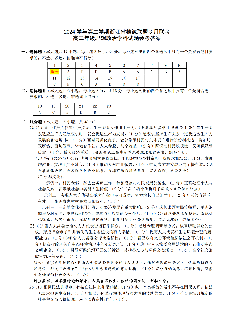 浙江省精诚联盟2024学年高二第二学期3月联考 政治答案.pdf