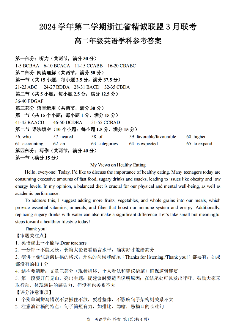 浙江省精诚联盟2024学年高二第二学期3月联考 英语答案.pdf