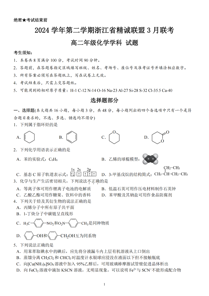 浙江省精诚联盟2024学年高二第二学期3月联考 化学.pdf