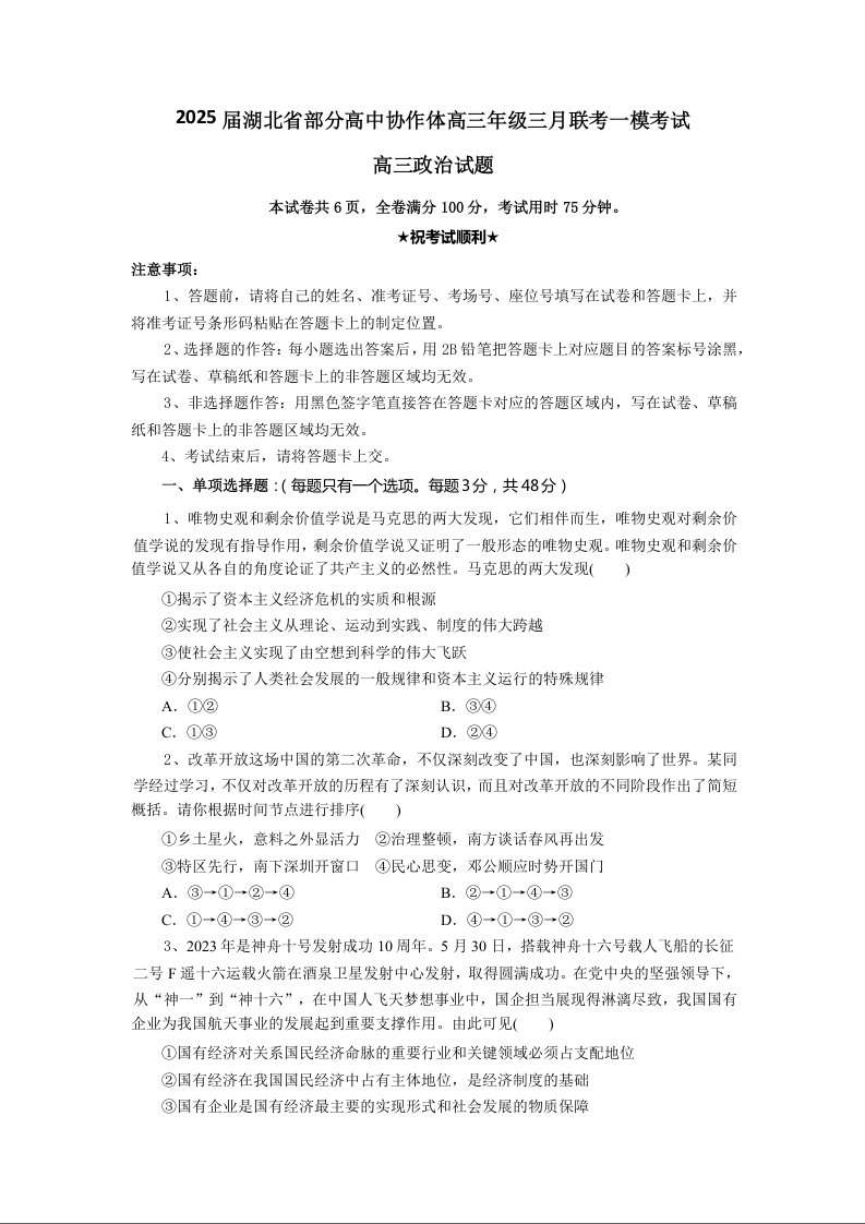 湖北省部分高中协作体2025届高三下学期3月一模联考 政治.docx