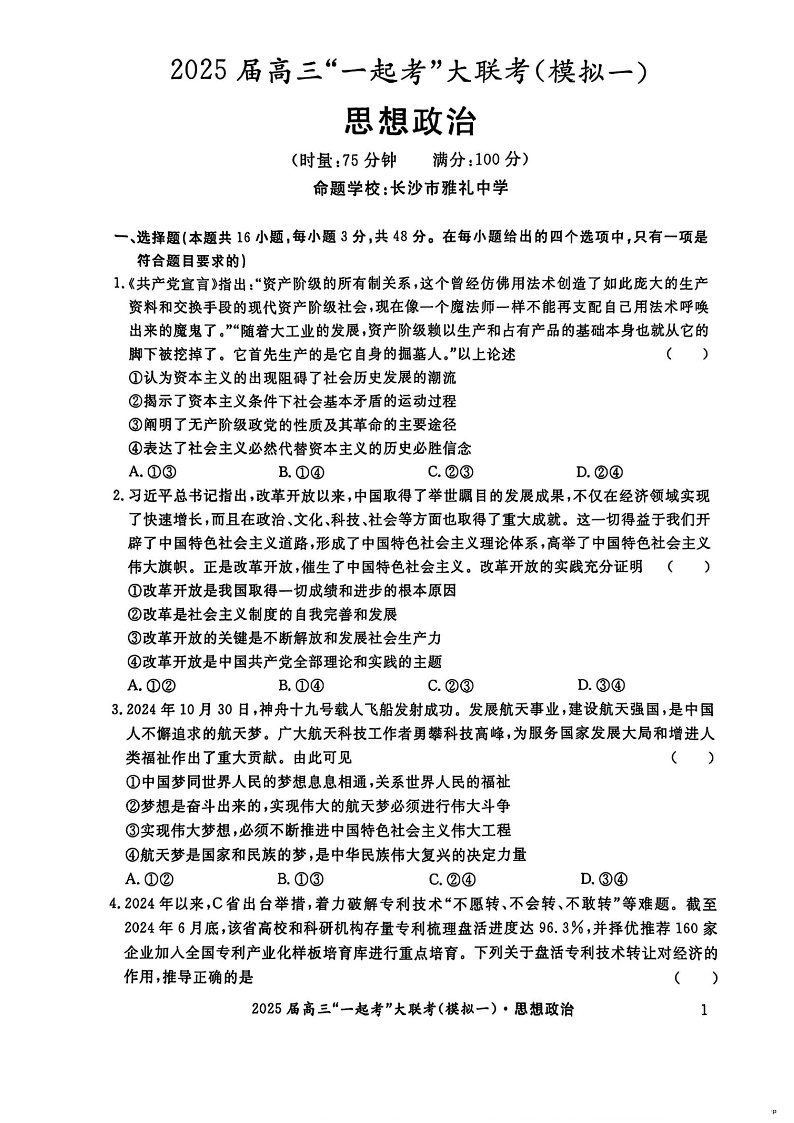 湖南省2025届高三“一起考”大联考(模拟一)政治.pdf