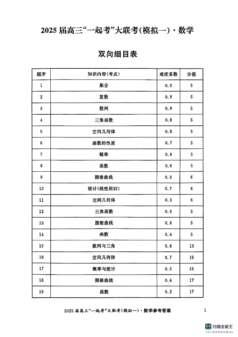 湖南省2025届高三“一起考”大联考(模拟一)数学答案.pdf