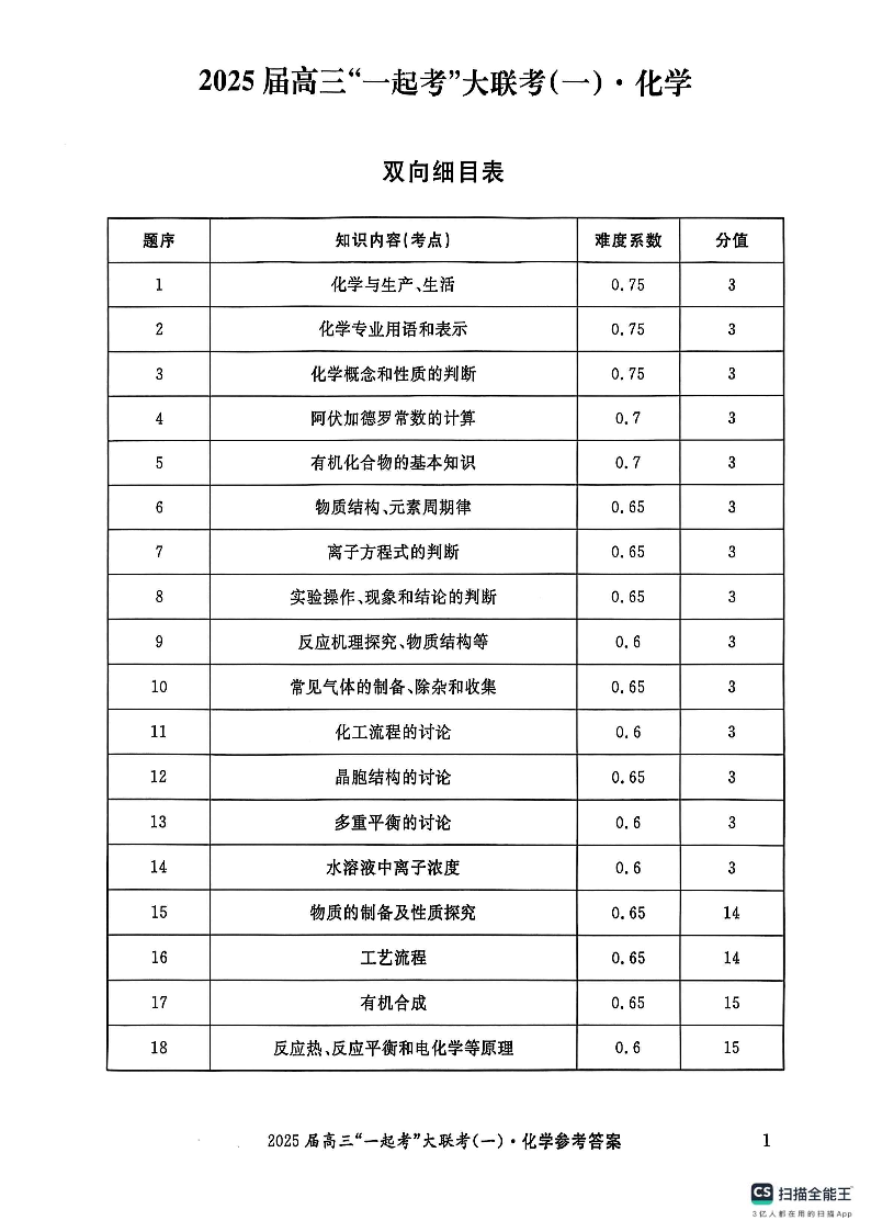 湖南省2025届高三“一起考”大联考(模拟一)化学答案.pdf