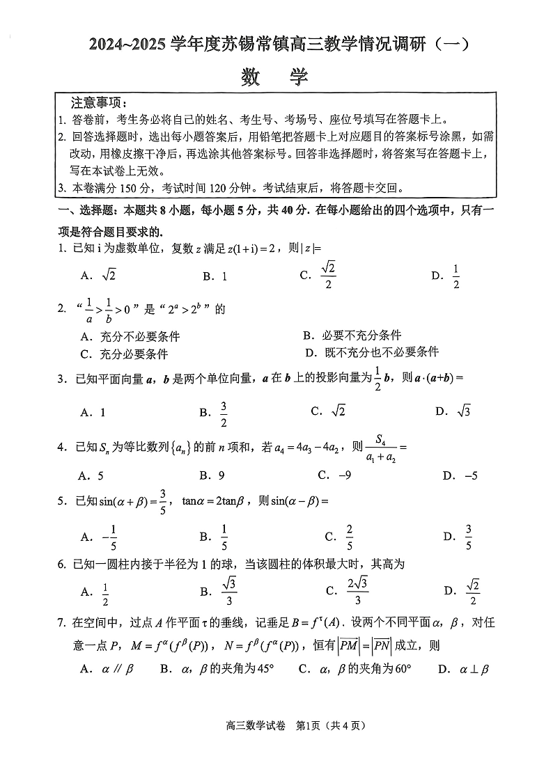 江苏省苏锡常镇一模2025届高三数学试题.pdf