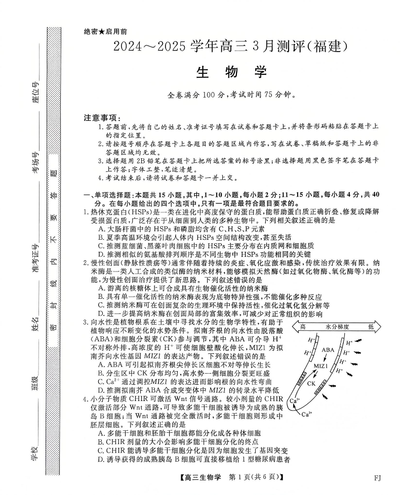 福建省部分地市校2025届高中毕业班3月质量检测 生物.pdf