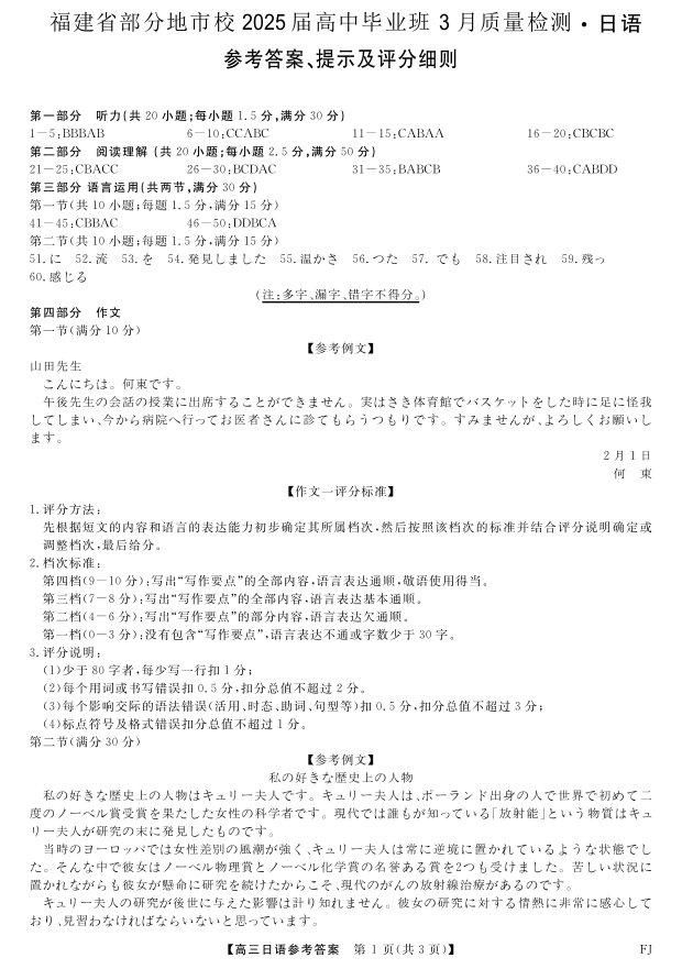 福建省部分地市校2025届高中毕业班3月质量检测 日语答案.pdf