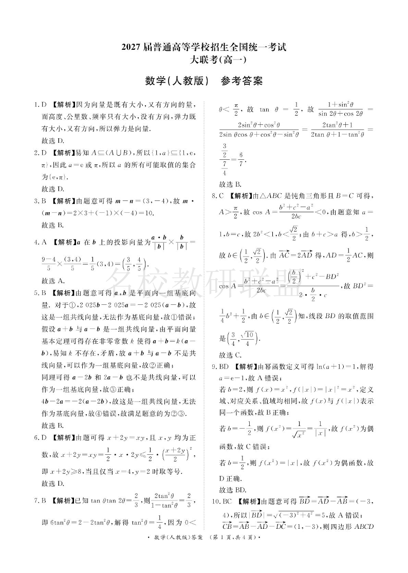 河南省部分名校2024-2025学年高一下学期3月联考 数学答案.pdf