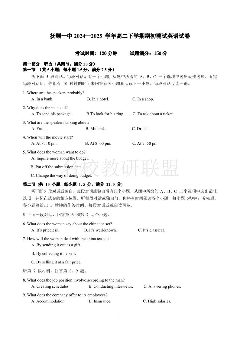 辽宁省抚顺一中2024-2025学年高二下学期期初考试 英语.pdf