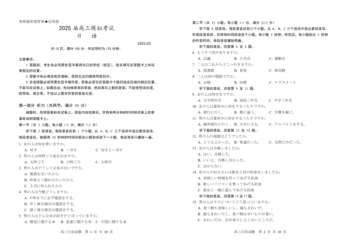 山东省枣庄市2025届高三模拟考试(枣庄二调)日语答案.pdf