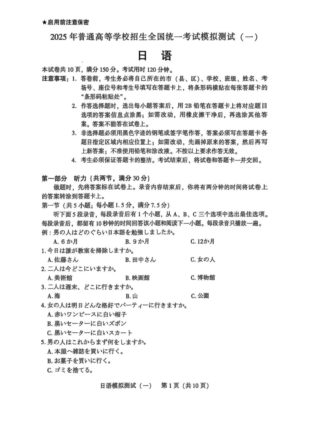 广东省2025届高三3月第一次调研考试 日语.pdf