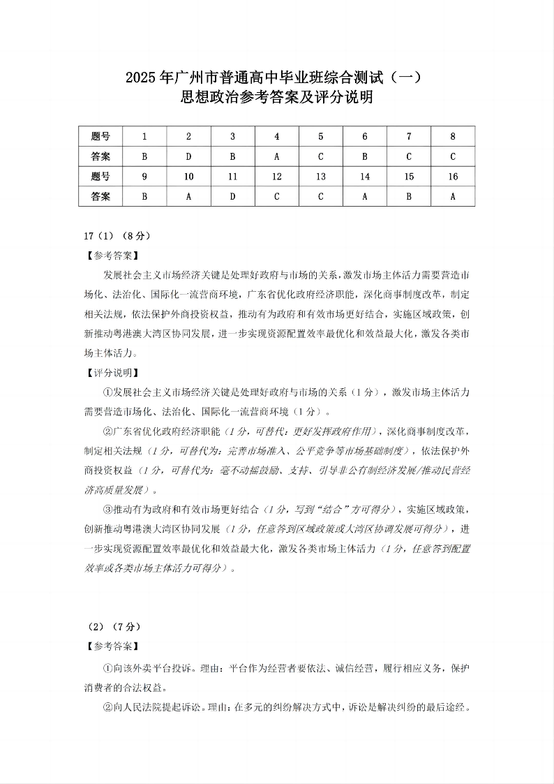 2025年广州市普通高中毕业班综合测试(一)政治答案.pdf
