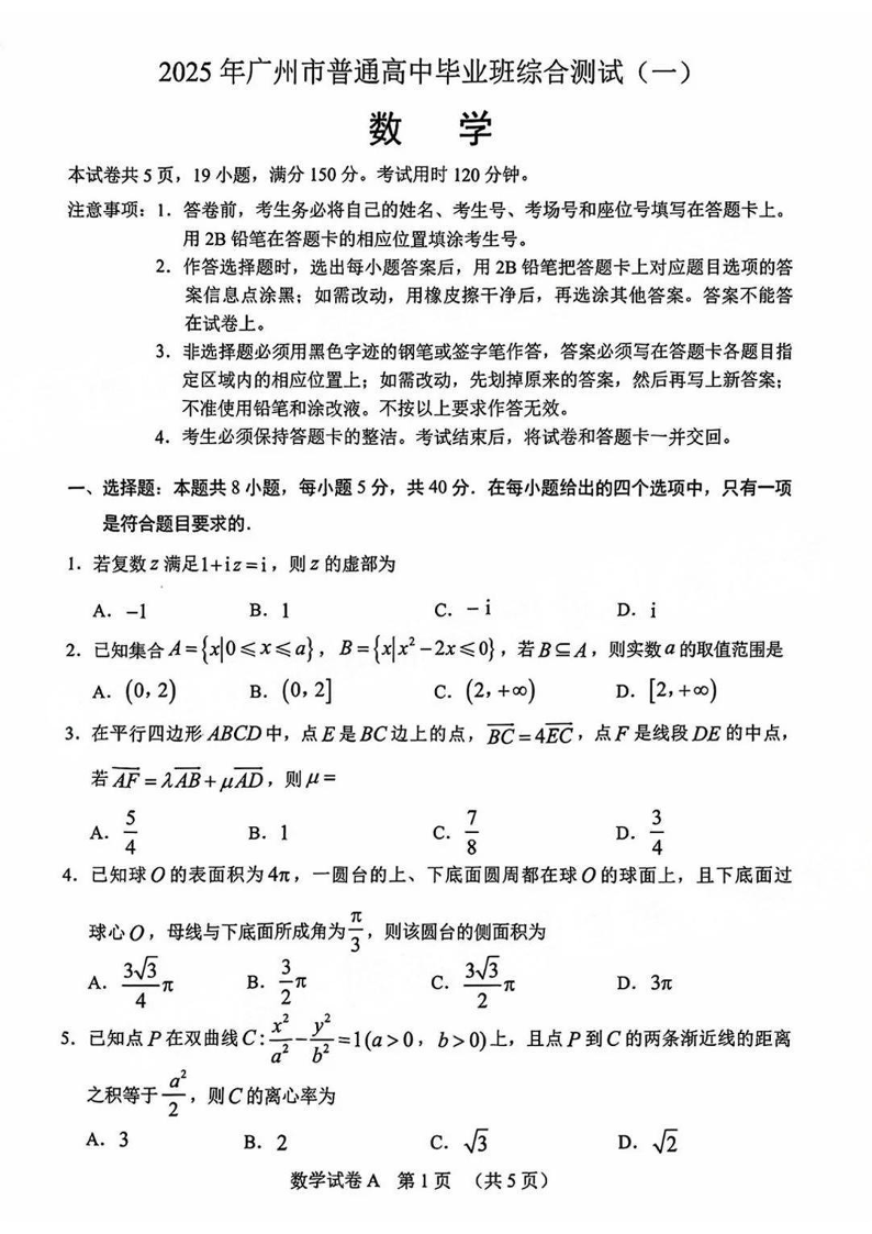 2025年广州市普通高中毕业班综合测试(一)数学.pdf