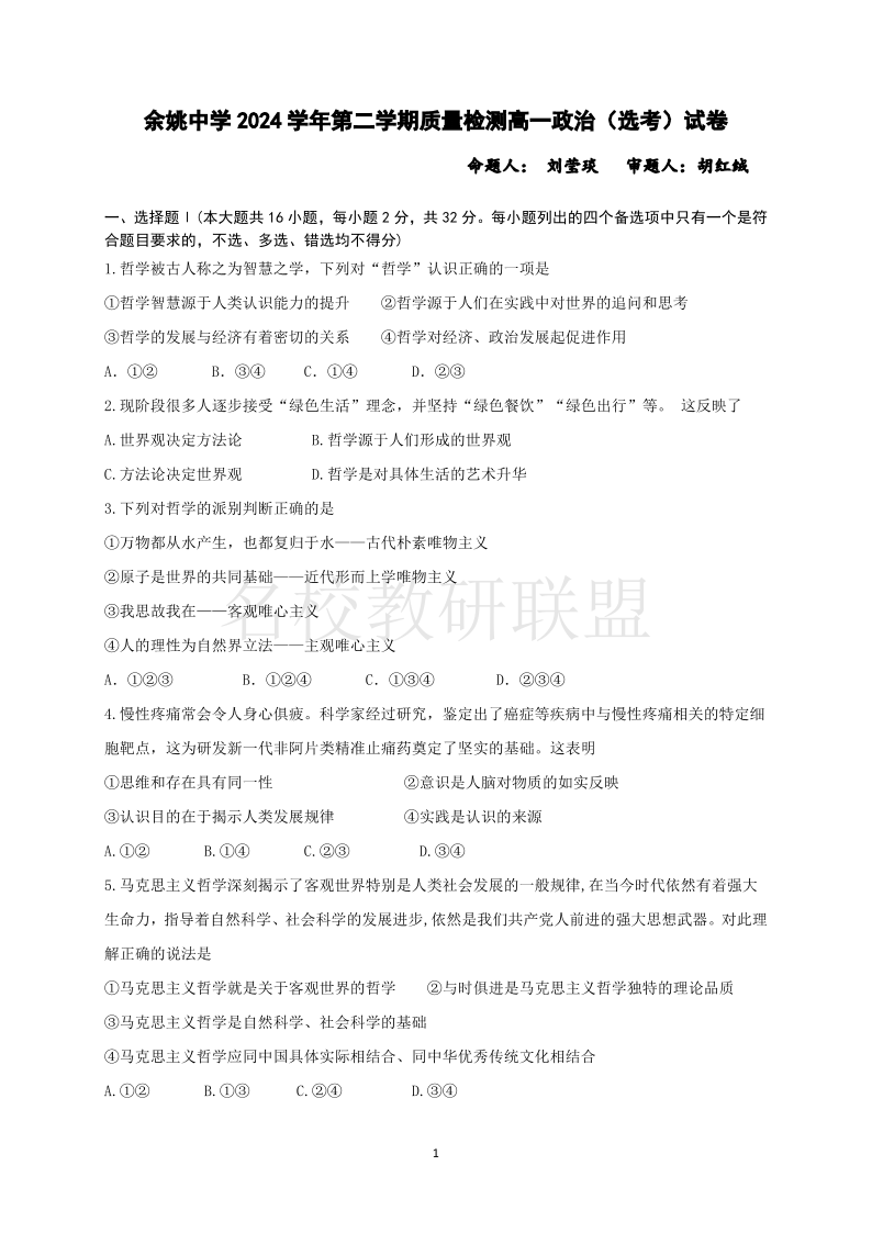 余姚中学2024学年第二学期质量检测 高一政治.pdf