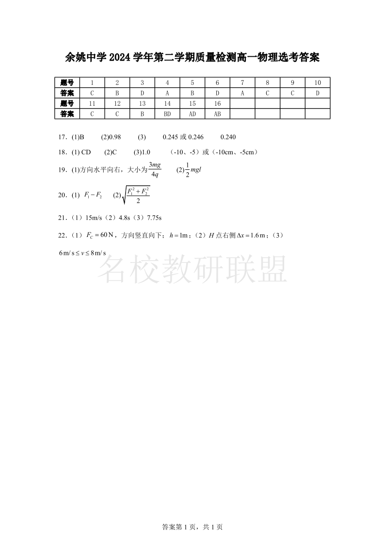 余姚中学2024学年第二学期质量检测 高一物理答案.pdf