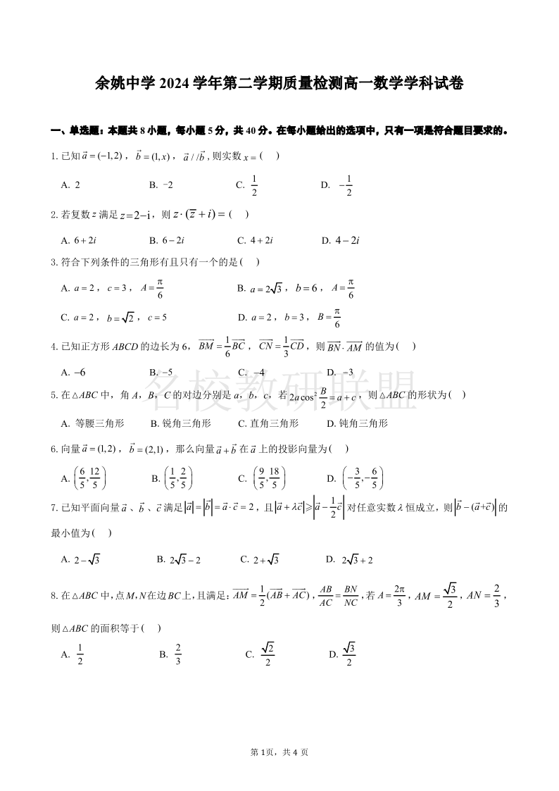余姚中学2024学年第二学期质量检测 高一数学.pdf