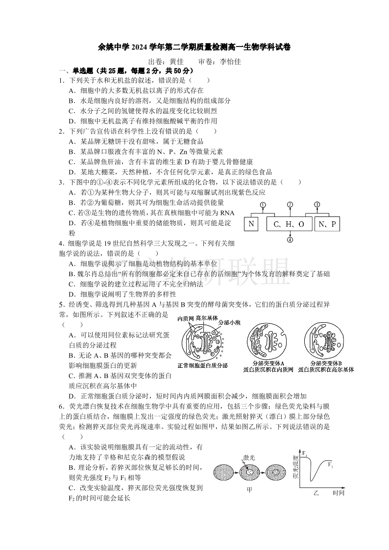 余姚中学2024学年第二学期质量检测 高一生物.pdf
