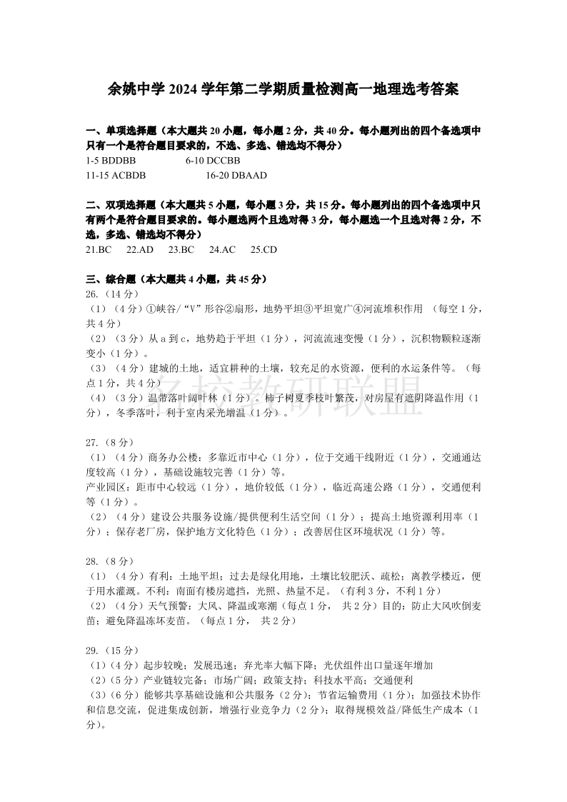余姚中学2024学年第二学期质量检测 高一地理答案.pdf