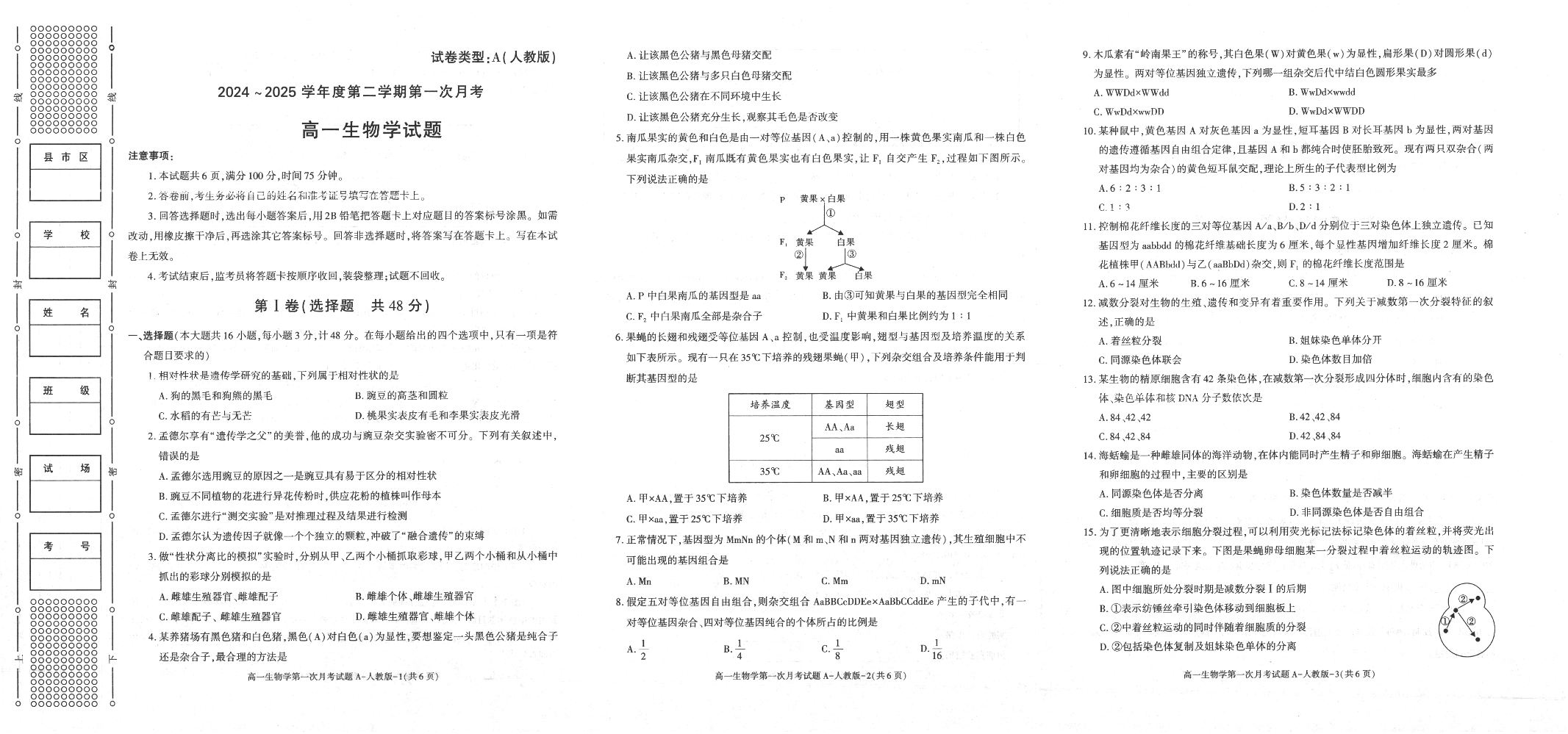 陕西省2024-2025学年高一下学期3月第一次联考 生物(含答案).pdf