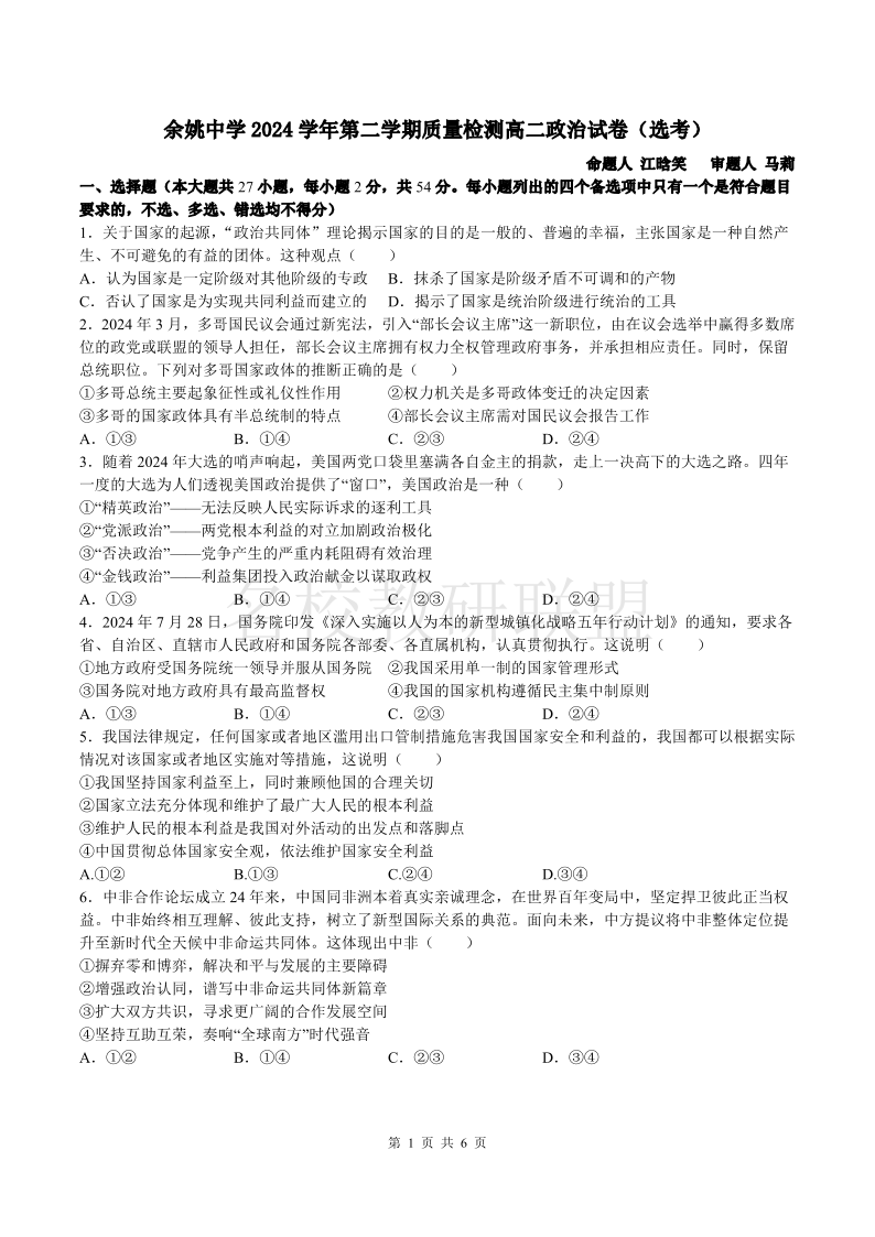 余姚中学2024学年第二学期质量检测 高二政治.pdf