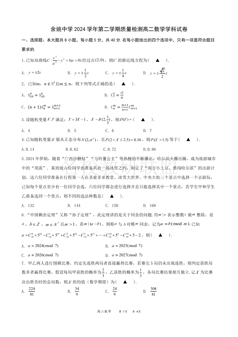 余姚中学2024学年第二学期质量检测 高二数学.pdf