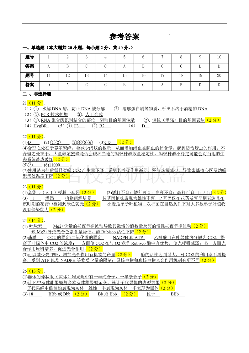余姚中学2024学年第二学期质量检测 高二生物答案.pdf