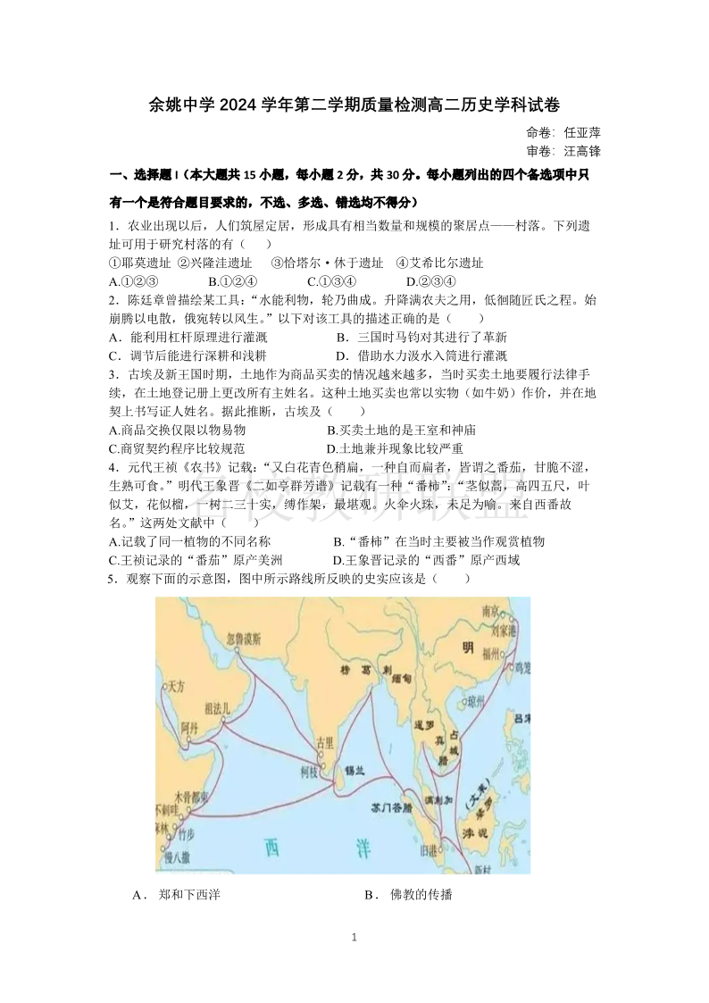 余姚中学2024学年第二学期质量检测 高二历史(含答案).pdf