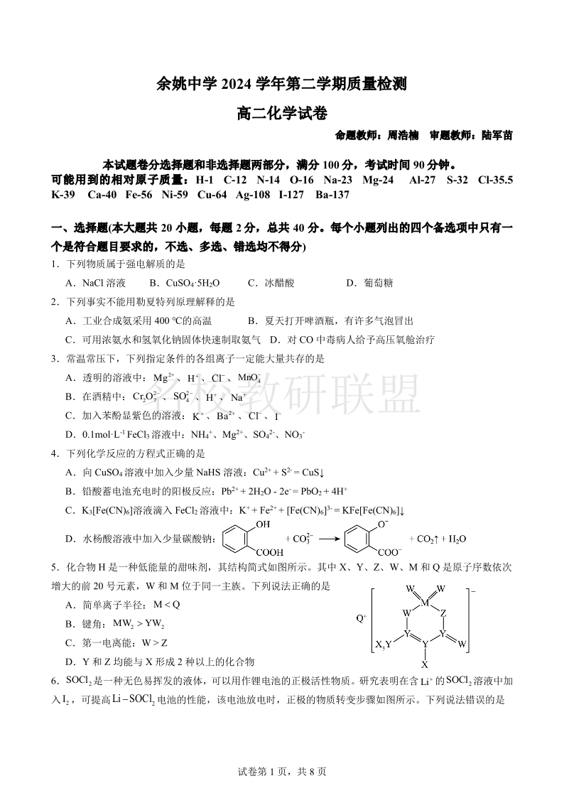 余姚中学2024学年第二学期质量检测 高二化学.pdf
