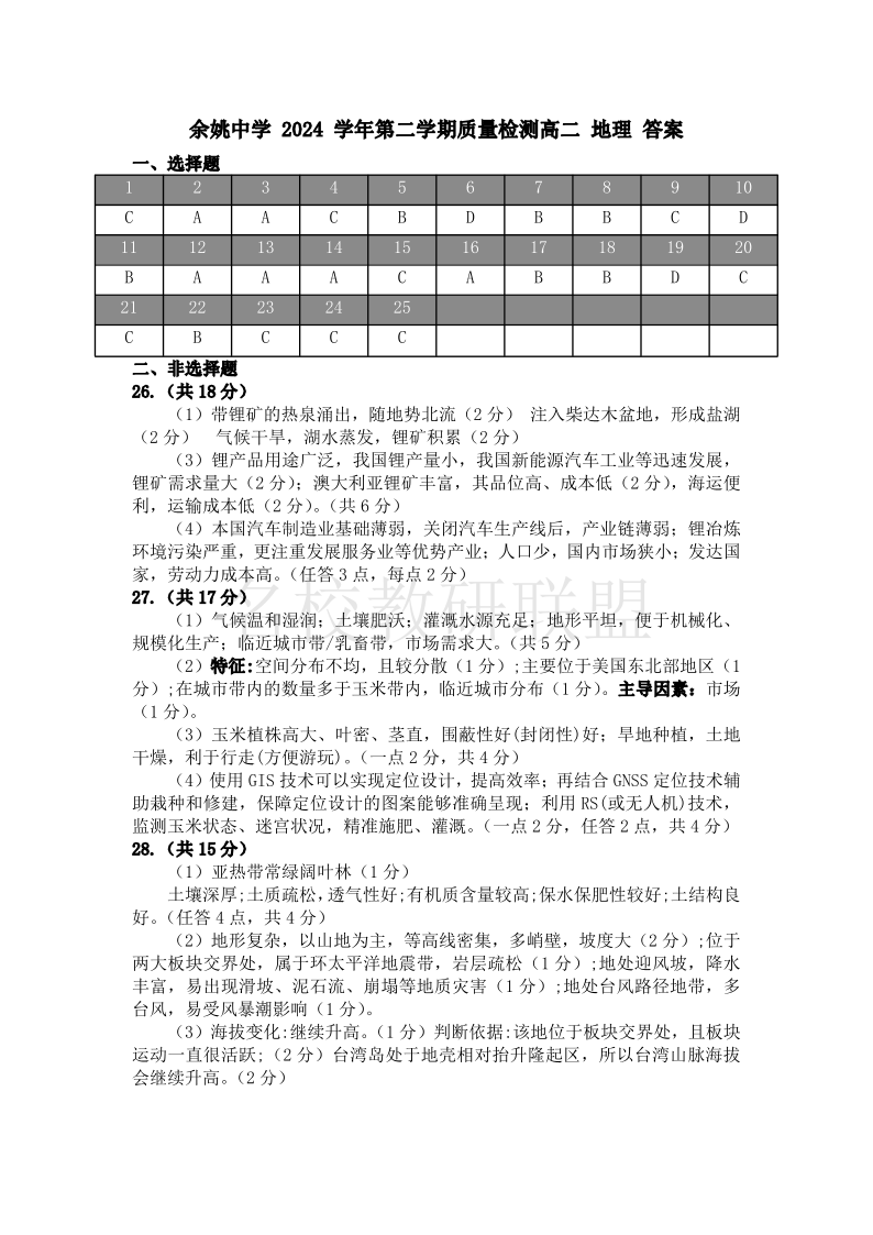 余姚中学2024学年第二学期质量检测 高二地理答案.pdf