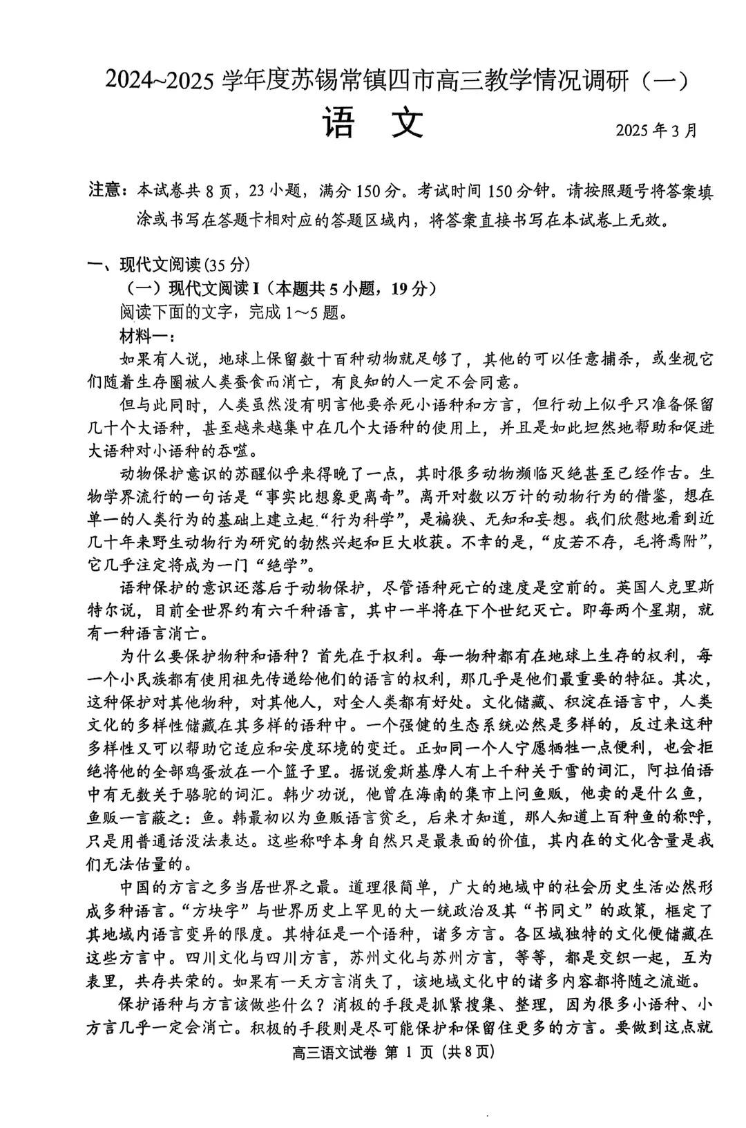 江苏省2024-2025学年度苏锡常镇四市高三教学情况调研(一)语文(含答案).pdf