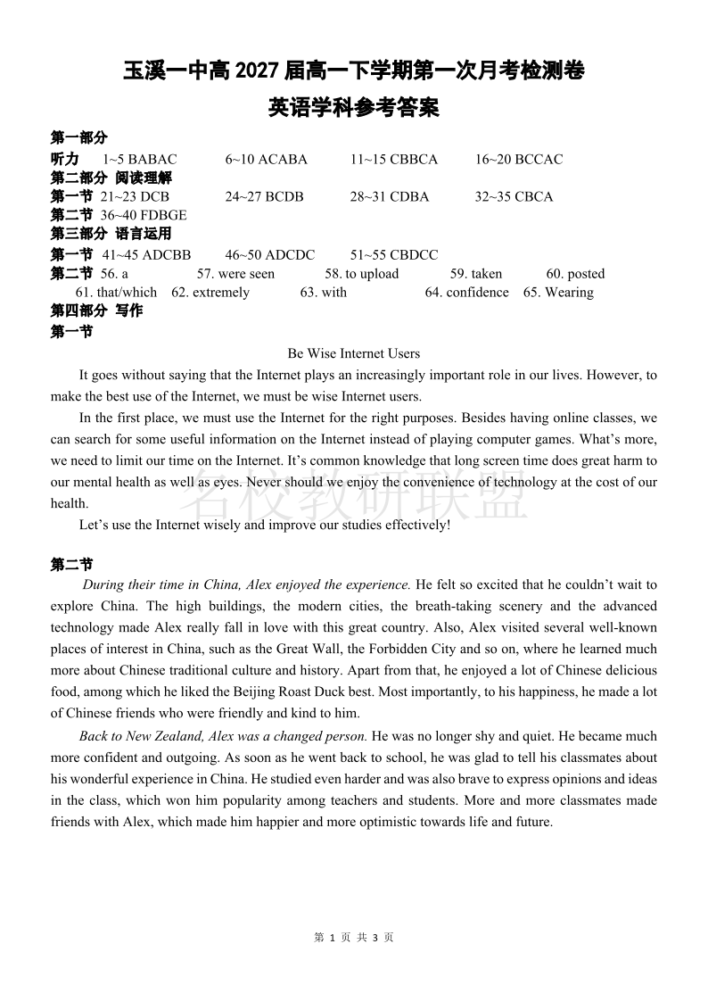 云南省玉溪市一中2024-2025学年高一下学期3月月考 英语答案.pdf