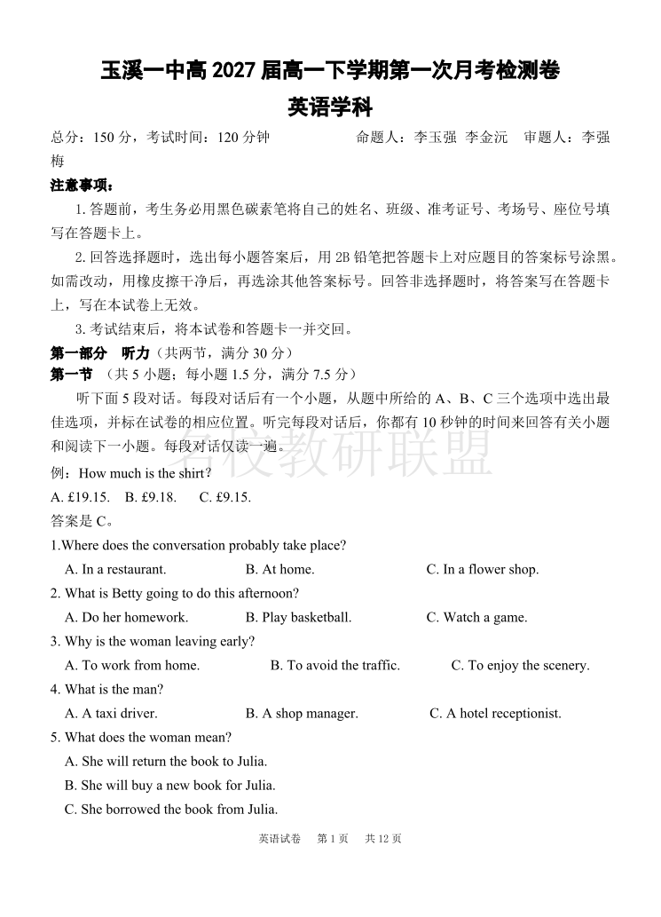 云南省玉溪市一中2024-2025学年高一下学期3月月考 英语.pdf